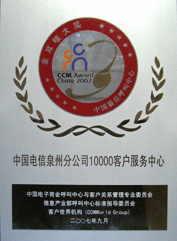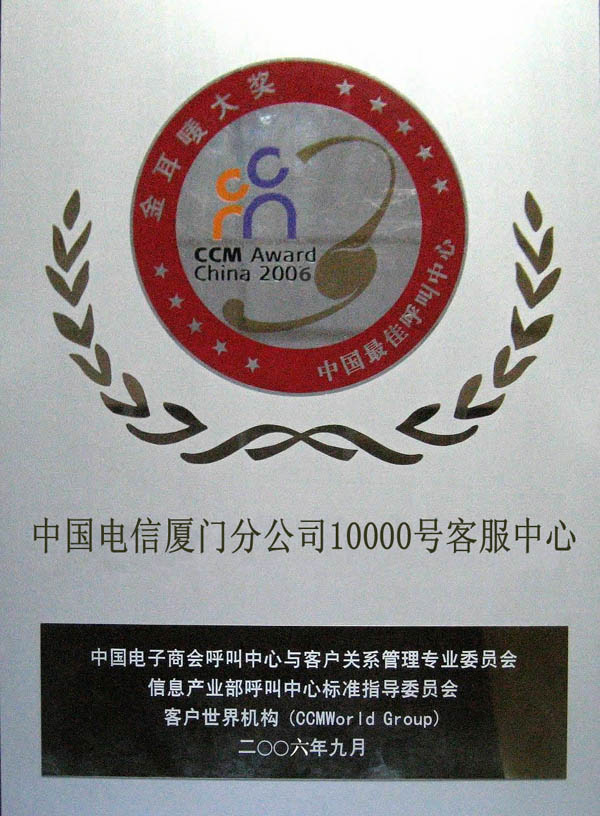 2008年中國最佳呼叫中心“金耳嘜大獎”暨本年度亞太最佳呼叫中心評選頒獎典禮于2008年10月16日在北京隆重舉行,本屆評審范圍涉及亞太地區(qū)十多個國家和地區(qū)的呼叫中心機構(gòu)。由庫易公司承建的福州10000號榮膺本屆“中國最佳呼叫中心”稱號,至此,我司承建的呼叫中心已連續(xù)三年獲得此稱號。在2006年、2007年由庫易科技建設(shè)并維護的廈門10000號呼叫中心系統(tǒng)、泉州10000號呼叫中心系統(tǒng),憑借其穩(wěn)定的性能和專業(yè)的服務(wù),分別榮膺“2006年中國最佳呼叫中心”、“2007年中國最佳呼叫中心”稱號。